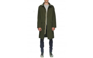 Military style coat with contrast panels on sleeve and zip flap. Centre front zip and button closure. Slim fit in 100% cotton.